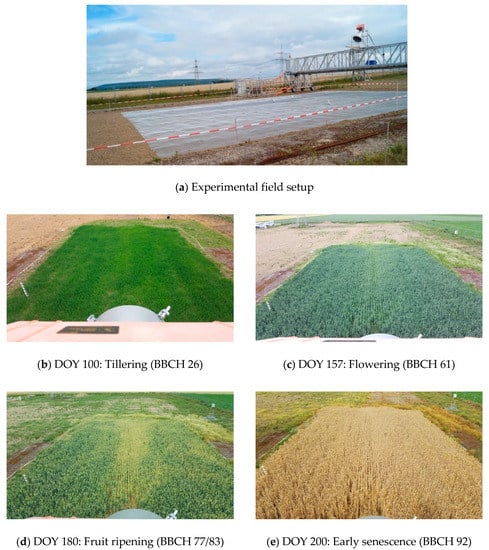 Experimental field setup (an aluminum bridge with ELBARA-II looking down toward the metal grid surface). (a) Vegetation conditions changing over the growing season of a winter wheat for selected phenological stages (b–e) at the Selhausen field laboratory (Germany) []. The experiment was conducted during a period of about 4 months from tillering of the winter wheat on April 10th (DOY 100) to the late senescence stage on August 14th 2017 (DOY 226).