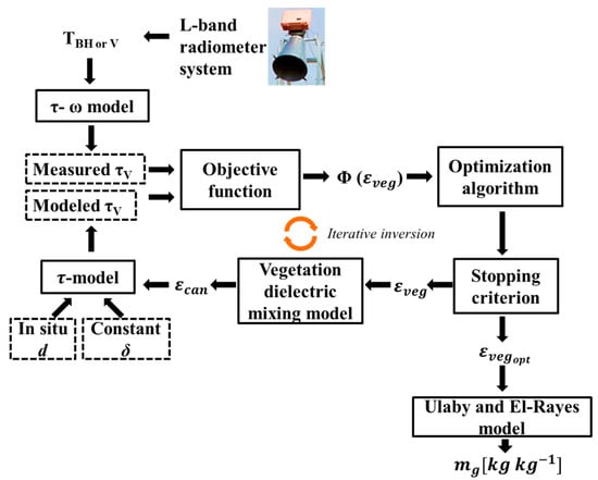 Figure 2 shows, conceptually, the retrieval scheme of mg. For the estimation of mg, the in situ measured vegetation height (d), a constant value of the vegetation volume fraction (δ), and the canopy dielectric constant (εcan) (i.e., which was derived from the modelled complex vegetation dielectric constant (εveg)) were used as input for the τ model. The output modelled τ values were then compared to the radiometer-derived τ values (i.e., which were estimated from L-band brightness TB measurements using the τ–ω model (see Section 2.1) by minimizing the objective function (φ), which is defined as the cumulative squared error between the modelled and measured τ. Finally, the optimal (opt) εveg is obtained from the best fit between τ-model and the radiometer-derived τ, and is converted to mg using the model of Ulaby and El-Rayes []. The different vegetation dielectric mixing models used to estimate εcan will be explained in Section 2.2.2. In addition, further explanations regarding the conversion of the εveg to the corresponding mg and vice versa will follow in Section 2.2.3.