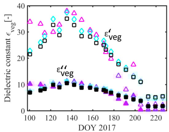 The obtained εveg values are comparable to vegetation dielectric constant values found for crops in literature. Ulaby and Jedlicka [] performed measurements of the dielectric properties of wheat and corn leaves and stalks at a frequency of 1.5 GHz and found values between 2.5 and about 35 for and values between 0 and about 10 for .