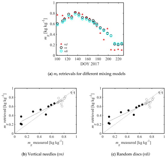 This can be also seen in the linear regression plots (Figure 4b,c), where the retrieved mg during the vegetative growth stages (i.e., open black circles) are located below (underestimation) and the retrieved mg during the senescence stages (i.e., filled black circles) are located above (overestimation) the ideal correlation (1:1) line. Concerning the slopes and intercepts of the regression lines, the vn dielectric mixing model shows a slightly closer fit to the 1:1 line.