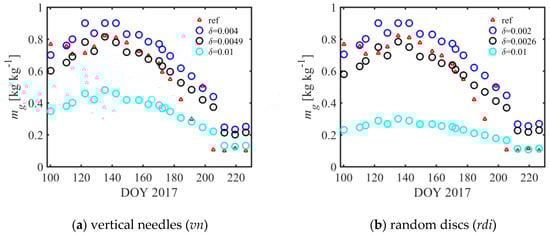 Numerical experiments were conducted to analyze the impact of assuming a constant δ on mg-retrievals. Figure 5 depicts the results of the mg-retrieval along the growing season using the vertical needles (vn) (a) and random discs (rdi) (b) dielectric mixing models with the in situ measured mg-values (ref) as a reference, for different values of δ. Results show that mean and STD values of mg steadily decrease for increasing δ (see also Table 3). When using the vn or rdi mixing model, a high δ (i.e., 0.01) leads to an underestimation of mg and if δ is low (i.e., 0.004 (vn) or 0.002 (rdi)) mg is overestimated. A δ of 0.0049 (vn) or 0.0026 (rdi) leads to the minimum in the objective function φ between the measured and modelled τV (but this minimum is not unique as mentioned before in Section 2.2.1) and to the closest fit between the retrieved and in situ measured mg. However, in general, there is no large difference in the temporal behavior of the retrieved mg when using the vn and rdi dielectric mixing models while varying δ. Concerning the mg-value range, it can be seen that mg ranges between ~0.2–0.45 for δ equal to 0.01 and ~0.25–0.95 for δ equal to 0.004 for the vn model and almost in the same range for the rdi model with mg values between ~0.15 and 0.3 for δ equal to 0.01 and ~0.25 and 0.95 for δ equal to 0.002.