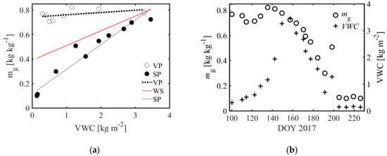 Linear regressions between the in situ measured gravimetric vegetation water content (mg) [kg kg−1] and the area-based vegetation water content (VWC) [kg m−2] for the whole growing season (WS)(open and filled black circles and red solid line), for only the vegetative growth phase (VP) (i.e., DOY < 160) (open black circles and dotted line), and for only the senescence phase (SP) (i.e., DOY > 160) (filled black circles and solid line) (a). In situ measured mg and VWC over time (b).