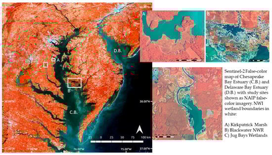 42], mapping the tidal wetlands of the Chesapeake and Delaware Bays for 2017. In this regional scale wetlands classification, we separated estuarine emergent wetlands from palustrine emergent wetlands. This separation corresponded to a general split between freshwater marshes and brackish/salt marshes. Our approaches utilized multitemporal satellite imagery from a single year and can be updated on an annual basis to provide annual assessments of change in tidal wetlands distribution. Our regional scale wetlands mapping effort leveraged the temporally dense record of publicly accessible satellite imagery including Sentinel-1A, Sentinel-2A, Landsat 8, and Advanced Land Observing Satellite (ALOS)—Phased Array type L-band Synthetic Aperture Radar 1 & 2 (PALSAR/PALSAR2) imagery.