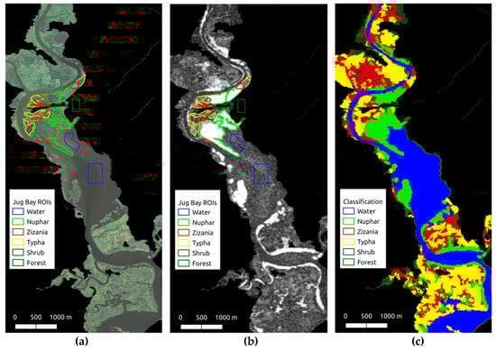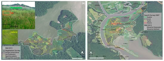 31]. With an increasing biomass of shrubs and trees, C-band signals saturate, limiting their ability to differentiate high biomass emergent marsh vegetation from forest- and shrub-dominated wetlands [