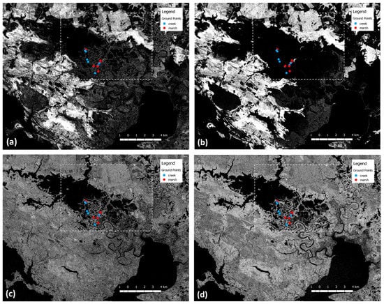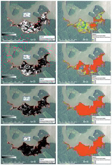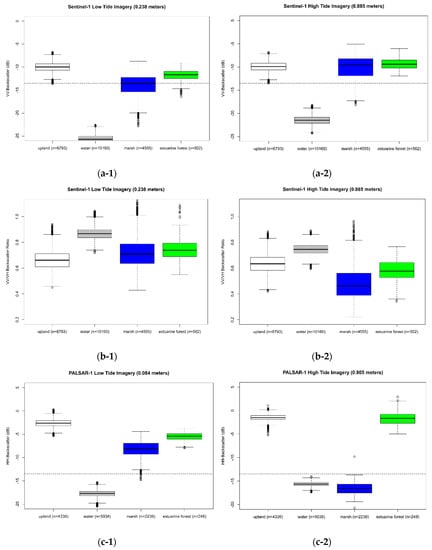 0HH high tide–low tide image pairs could be used to unambiguously separate inundated and non-inundated tidal marshes using absolute thresholding. The threshold value of −13.5 dB separating inundated and non-inundated marsh was similar to the −14.0 dB threshold used by Clewley et al. to map surface water with PALSAR imagery [