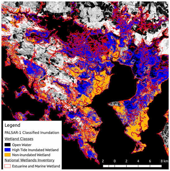 38], it is less effective for inundation detection under vegetated canopies than SAR imagery. However, multi-season mNDWI imagery was included in the regional scale classification to provide a characterization of open water extent as a complement to the SAR imagery characterizing wetland inundation extent.