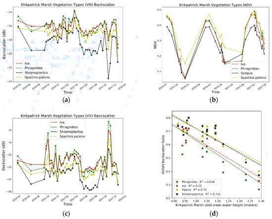 40]. In contrast, our results demonstrated that all four dominant vegetation types of Kirkpatrick Marsh exhibited backscatter increases during inundated conditions, despite having pronounced differences in biomass and structure. This may be attributed to the collapse of vertical stems and leaves during fall, resulting in increasingly horizontally structured vegetation, which enhances double-bounce scattering in vertically polarized SAR signals when the underlying marsh surface is inundated. It is also likely that the change in vegetation structure combined with senescing vegetation becoming saturated with saline water during or following high tide (but not submerged) may have increased backscatter by increasing the dielectric constant of the partially collapsed vegetation, which was also acting a rough surface, thus increasing the direct σ