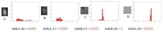 which sums up the minimum values in all pairs of corresponding bins from h and . As shown in Figure 3, the s on s are distinct for distinguishing targets and backgrounds, although less information is provided due to the dim appearance of the vehicles.