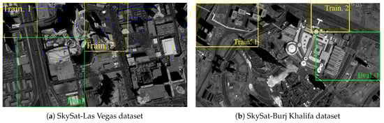 The SkySat-Las Vegas dataset refers to the satellite video captured over Las Vegas, USA in March 2014. As illustrated in Figure 4a, two sub-regions were selected for training and one sub-region was selected for evaluation.