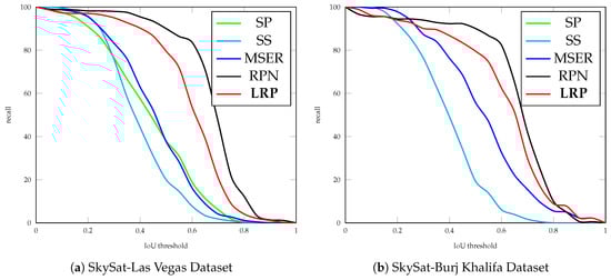 The region proposal performance was compared with a set of existing region proposals approaches for both common object detection tasks as well as aerial object detection tasks. Inspired by the systematic region proposal evaluation research [], the proposed region proposal scheme was evaluated against Superpixels (SP) [,], Selective Search (SS) [] and Region Proposal Network (RPN) []. SP generates a region proposal for each extracted superpixel, and SS merges neighboring superpixels as region proposals. For both SS and SP the extraordinarily tiny or large region proposals are considered impossible for vehicles in satellite videos and removed by post-processing. In addition to these well-known region proposals techniques, two approaches for aerial object detection are also included for comparison, which are Maximally Stable Extremal Regions (MSER) [] or Top-hat-Otsu [].