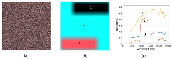 One cause for piecewise convexity of the hyperspectral data cloud is that materials in the scene are not uniformly distributed so certain mixtures of materials are not possible due to spatial constraints. Figure 1 illustrates this idea using simulated images that consists of a scene with three different materials distributed in two scenarios: (i) spatial random distribution with no spatial structure as shown in Figure 1a, and (ii) each material occupies a uniform spatial region as shown in Figure 1b. Figure 1c shows the spectral signatures of the materials used in the simulations. The bands used for the false-color composite were 700 nm for Red, 540 nm for Green, and 470 nm for Blue.