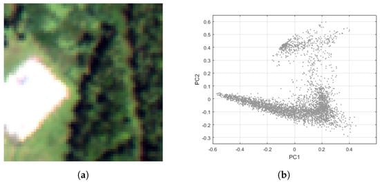Fort A.P. Hill image chip: (a) true-color composite, and (b) scatter plot for the the first-two principal components (PC-1 in the horizontal axis and PC-2 in the vertical axis).