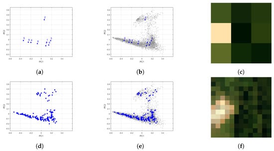 of the spectral signatures in a superpixel is used to represent each superpixel [31,32,33]. In Equation (3), n is the number of spectral signatures in the superpixel, and is the spectral signature inside the superpixel. Each superpixel mean may represent tens to thousands of pixels in an image. Further hyperspectral image processing is performed in the superpixel means, which results in significant computational saving over full pixel-by-pixel processing. Representing the image by its superpixels can be interpreted as a non-uniform sub-sampling of the image. To illustrate the effects of superpixel representation in the spectral domain, Figure 8 shows where the mean for each superpixel is located in the scatter plot for SLIC segmentations with region size set to 25 (Figure 6) and region size set to 5. The means in Figure 8a,b are numbered based on their order of appearance in Figure 6. Centroid number 1 corresponds to Figure 6a, centroid 2 to Figure 6b and so on.