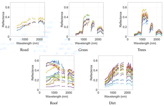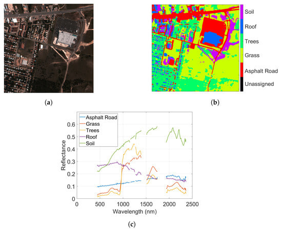 HYDICE Urban is a widely used hyperspectral data set used in unmixing studies. It was collected with the Hyperspectral Digital Image Collection Experiment (HYDICE) sensor in October 1995. The scene is an urban area at Copperas Cove, TX, USA [41]. The scene has pixels at 2 m resolution, and 210 bands between 400 nm to 2500 nm at a spectral resolution of 10 nm. After channels 1–4, 76, 87, 101–111, 136–153 and 198–210 are removed (due to dense water vapor and atmospheric effects), we end with 162 channels for processing. The data are already calibrated to reflectance. Figure 11a presents a true-color composite using band 28 (680 nm) for red, band 14 (540 nm) for green, and band 7 (470 nm) for blue. A reference from [42] shown in Figure 11b is used here as a reference classification map. The classification map shows five information classes: Asphalt, Grass, Tree, Roof and Soil (Dirt). An endmember spectral library is also available from [42] and is shown in Figure 11c. The reference data also include abundance maps for these classes, and we will use them later for algorithm assessment.