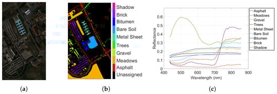 ROSIS Pavia University (a) true-color composite; (b) reference class map; (c) endmembers.