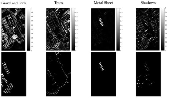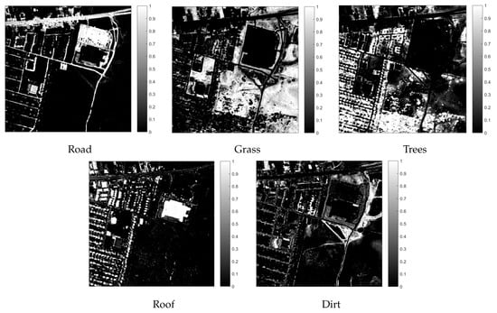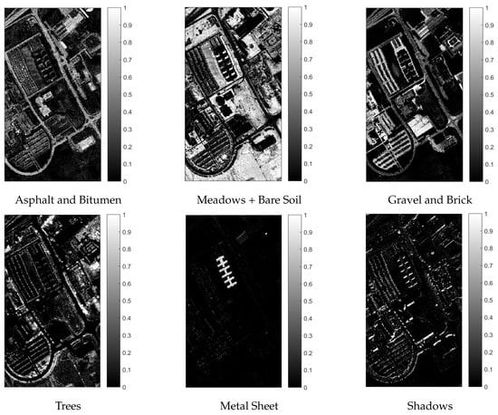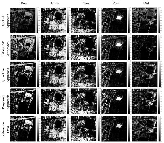 The Gram method estimated 16 spectral endmembers for the full hyperspectral image and 10 for its full SP representation with no quadtree partitioning. Endmembers were extracted using SVDSS and abundances estimated with NNSLO. Spectral endmember abundances were manually grouped into information classes by visual comparison with the reference map. The resulting abundance maps for the information classes are shown in the first two rows from top to bottom in Figure 29 and the corresponding spectral signatures in Figure 30.