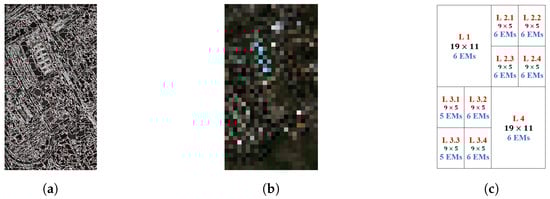 First, superpixels (SP) were extracted using the SLIC algorithm with a region size of ; this particular size was selected based on the work by [28]. The result was a nearly grid of superpixels (a total of 394 superpixels since very small superpixels were merged with larger ones). The SLIC segmented image is shown in Figure 13a.