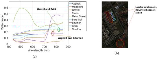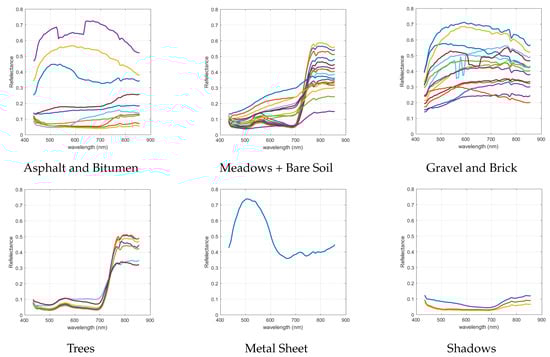 This is a scene acquired with the ROSIS sensor during a flight campaign over Pavia, northern Italy. The image consists of 103 spectral bands from 430 to 860 nm with a spectral resolution of 4 nm and a spatial resolution of 1.3 m. Only 103 bands are used for the unmixing analysis. Pavia University is pixels. Figure 12a shows a true color composite of the scene. The reference classification map for the Pavia University scene is shown in Figure 12b. The classification map shows nine classes: Asphalt, Meadows, Gravel, Trees, Metal Sheet, Bare Soil, Bitumen, Brick and Shadow. The unassigned pixels in the image are colored in black and labeled as “background”. Figure 12c shows the endmembers for the labeled samples.