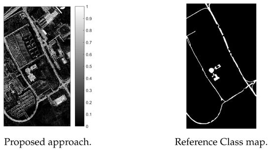 Here, we will follow the assessment methodology described in [44] based on the agreement matrix (similar to the error or confusion matrix in classification) between the generated class map and the reference classification map. We will also perform visual comparison between abundance maps and individual binary class maps. This helps us assess whether or not we are extracting the right spatial distribution of the information classes. Note that information classes in the classification maps may correspond to multiple endmember classes. In the case of the HYDICE Urban image, there are reference abundance maps from [41], which allow for a more quantitative comparison. However, there is no information on the accuracy of these reference abundances in [41]. We will still compare derived and reference abundance maps in what follows.