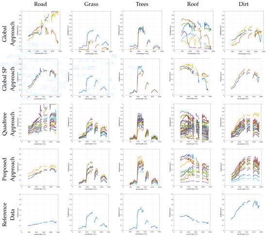 By visually comparing the spectral signatures extracted using the global method to the ones available from the reference data (Figure 30), the extracted endmembers do not look similar to the reference data in terms of shape. This is easily noticed for the Road class, while, when comparing the endmembers obtained from the Global SP approach to the reference data, there is a better similarity in terms of shape (except for the road and roof classes).