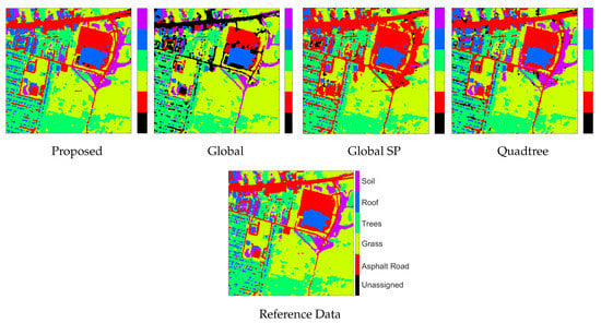 Table 8 shows a comparison of the harmonic means, overall agreements and kappa statistic for all four approaches. The proposed approach (SP + QT) has the closest agreement with the reference data as shown by the highest harmonic means, highest kappa and highest overall agreement (All shown in bold). This means it has an overall better per-class agreement than the other methods. In addition, when comparing Table 2 and Table 7, we can see that the proposed approach has higher producer agreement rates than Full+QT for all classes except Road. In user agreement, Full + QT has lower agreement rates for Road and Grass. The results do point to significant differences between SP + QT and Full + QT. Full + QT is significantly more computationally demanding than SP + QT. The endmember extraction stage comprised of quadtree segmentation and application SVDSS to the tree leaves when performed on the full image requires processing pixels, while, for the SP representation, we only need to process 394 superpixels. The additional overhead for SP segmentation and the computation of the means are lower than the quadtree segmentation. Abundance computation uses NNSLO applied to all pixels in both approaches.