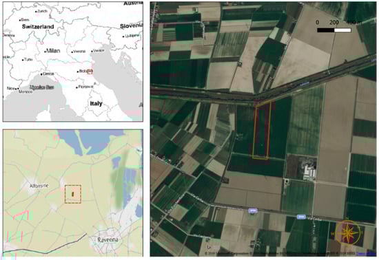 The field site was located in the plain near Ravenna, Italy (44° 29′ 26″N, 12° 07′44″E, 0 m above sea level), a few kilometres from the Adriatic coast (Figure 1). An 11.07 ha experimental area was chosen within a larger field (ca. 25 ha) of the Agrisfera Cooperative. Soils in this area have a variable texture depending on changes in sediment dispersal patterns in response to fluctuating sea level []. To cope with the limited elevation and shallow water table, a network of underground draining pipes discharging into a ditch on the north side serves the field. The climate falls in the Mediterranean North environmental zone [], with mild winter and a long growing season, although precipitation is mostly concentrated in the cold semester.