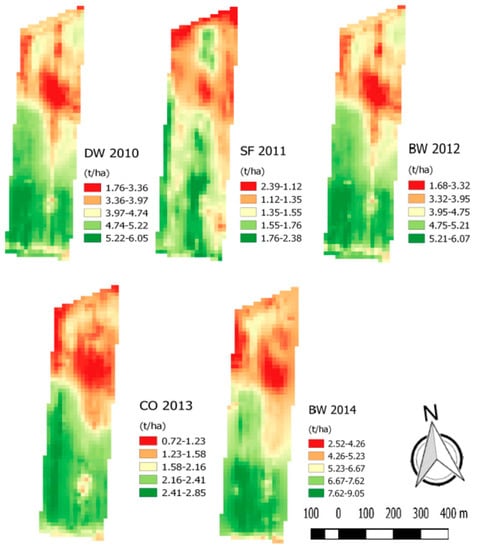 Yield maps exhibited a quite similar pattern in the five years, as shown in Figure 2. The north side of the field always featured a lower GY than the south side. Especially the three years with wheat (DW 2010, BW 2012 and 2014) behaved in a similar way with lowest yield rank in the north-central portion of the field, and highest yield rank in the south–southwestern portion. Compared to this, the two spring sown crops (SF 2011 and CO 2013) exhibited a slightly wider area of low GY in the north portion of the field. These two crops also featured higher CV (Table 4), i.e., higher yield variation than the three wheat crops.