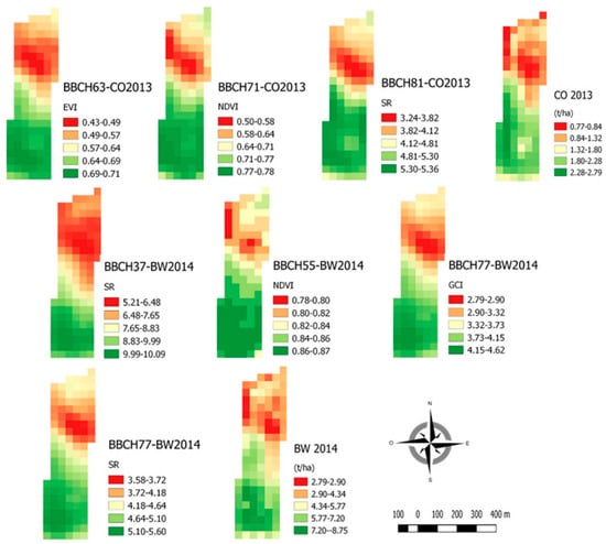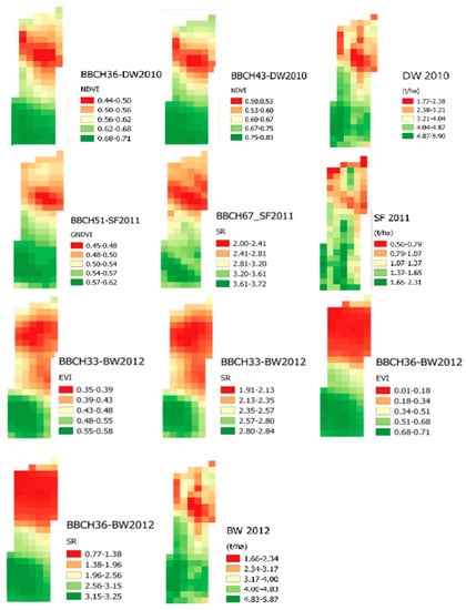 Some VIs at specific growth stages evidenced sharp differences between the two areas, as in the case of EVI and SR at BBCH 36 in BW 2012. Some other VIs depicted faded differences, as SR at BBCH 67 in SF 2011. However, spatial maps visually demonstrate that a small number of high remote VIs were associated with low final GY and vice versa.