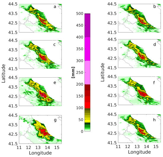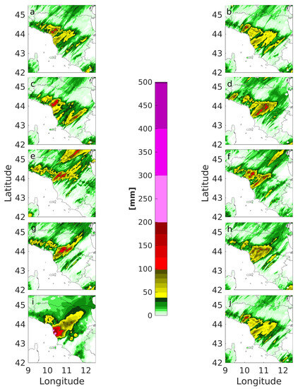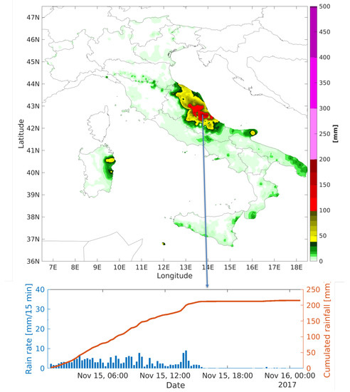 The resulting observed Quantitative Precipitation Estimate (QPE) for the time period 18UTC 9 September 2017–06UTC 10 September 2017 is shown in Figure 1. The map is obtained interpolating the raingauge data using a semivariogram directly estimated from data themselves [21] (courtesy of the Italian Civil Protection Department). The lower panel of Figure 1 highlight the very timely concentrate rainfall event (Type II) with more than 200 mm of rain felt down in three hours. It was also found that an intense lightning activity, indicative of the ongoing convective dynamics, took place (not shown).