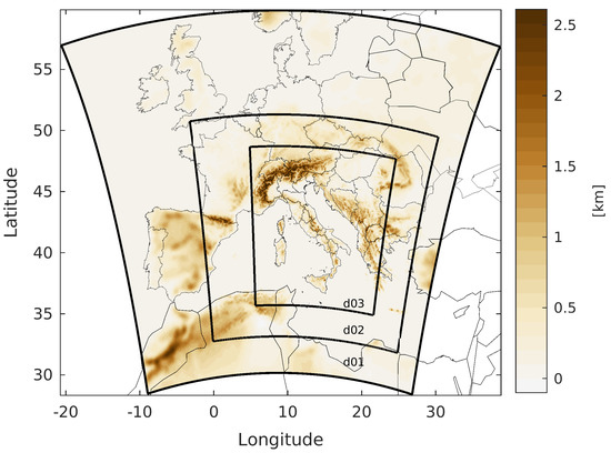 The Weather Research and Forecasting (WRF) model [13] was selected as numerical weather model to accomplish all the experiments carried out within the framework of the STEAM project. It is a compressible non-hydrostatic model with mass-based terrain-following coordinates that was developed at the National Center for Atmospheric Research (NCAR) in collaboration with several institutes and universities for operational weather forecasting and atmospheric science research. In this work the adopted version for WRF is 3.8.1, while for the data assimilation package (WRFDA [22]) is 3.9.1. For this study the three domains setup shown in Figure 3 has been adopted. The domains have, respectively, a horizontal grid spacing of 13.5 (250 × 250 grid points), 4.5 (451 × 450) and 1.5 km (943 × 883) with 50 vertical levels (Figure 3, all domains top reach 50 hPa).