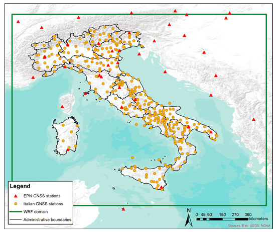 ZTD time series at 30 s resolution were estimated for all the geodetic permanent stations within the WRF domain to perform data assimilation experiments. For the selected events the data of 375 permanent stations were available (Figure 4). The iono-free phase range combination of dual-frequency GPS-only observations for three days including the selected events were processed in PPP mode. An accuracy assessment [37] of the GNSS-derived ZTD time series was performed by comparison with 43 radiosonde launches from eight Italian radiosounding datasets. This comparison yielded a mean difference in ZTD of 0.3 cm and a standard deviation of 1.46 cm (not shown).