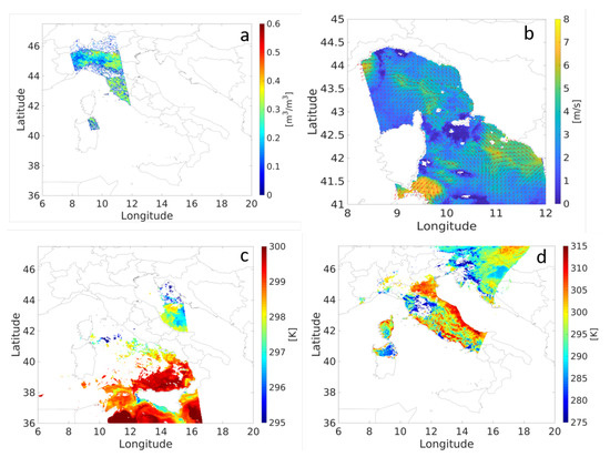 Sentinel observational data available for the Livorno test case. Soil moisture in panel (a), wind speed and direction in panel (b), Sea Surface Temperature in panel (c) and Land Surface Temperature in panel (d).