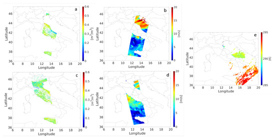 For the SST, the Sentinel-3 data acquired on 14 November 2017 at 20:24 UTC were used, while cloud free optical data to derive LST were not found for the Silvi Marina event. For what concerns SM, WD and WS, Sentinel-1 observed the area of interest area on 14 November 2017 at 05:10 UTC (descending orbit) and at 17:06 UTC (ascending orbit). To apply the multi-temporal SM retrieval algorithm, even the Sentinel-1 data acquired on 8 November, 2 November, 27 October and 21 October 2017 were gathered (both ascending and descending orbits). Figure 6 shows the available EO observational data.