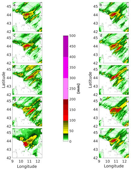 GFS-driven cases. Quantitative Precipitation Forecast (QPF) values for the 12 h time period from 18UTC on 9 September 2017 to 06UTC on 10 September 2017, where (a) = LST, (b) = SST, (c) = SM, (d) = WIND, (e) = ZTD_GNSS3h, (f) = ZTD_GNSS3h_1ist, (g) = WIND+SM+ZTD_GNSS3h_1ist, (h) = WIND+SM+ZTD_GNSS3h_1ist_18UTC (only 18UTC), (i) = OBS, (j) = OL. For details about the different ingestion approaches the reader is referred to the main text.