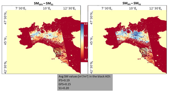 Difference maps between the IFS-driven SM experiment and the Sentinel-derived SM (SM-SM, on the right) compared to the difference between the GFS-driven SM experiment and the Sentinel-derived SM (SM-SM, on the left). The black area represent the Area Of Interest (AOI) on which mean values are compared.