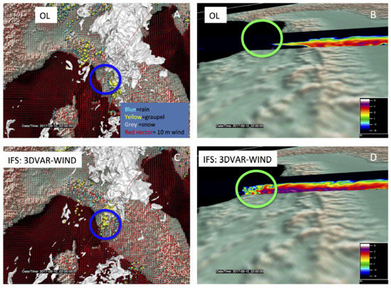To gain a deeper insight of the modelling experiments, the best performing IFS-driven case, namely the WIND one, is compared with the OL. In particular, Figure 11 shows the atmospheric state of the two experiments at 02UTC on 10 September 2017, corresponding to the most intense phase of the observed event, displayed with the VAPOR (Visualization and Analysis Platform for Ocean, Atmosphere and Solar Researchers, www.vapor.ucar.edu) software. Over the same scene (Figure 11), 3D isosurfaces ( kg/kg) for the rainwater, snow and graupel variables have been rendered in combination with the wind field at 10 m in case of the OL (panel a) and IFS 3DVAR-WIND case (panel c). The results show that over the area interested by the most intense observed rainfall phenomena (blue circle) the OL run is not able to produce any significant convective phenomena, while the IFS 3DVAR-WIND does so. This is also visible in the vertical cross sections of the reflectivity field for the two modelling experiments (green circles panels b and d): while reflectivity is nearly absent nearby the Tuscany coastlines (Livorno area) for the OL experiment (panel b), conversely strong activity is apparent in panel d over the Livorno area and downshear the main convective system, with values peaking up to 50–55 dBz. Similar improvement is achieved also in the GFS-driven case, as shown in Reference [12].