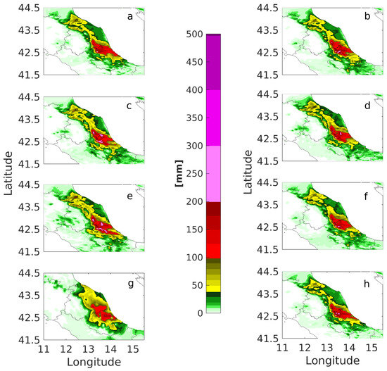 Looking at the different rain depth threshold values, the behaviour of the assimilation of different variables can be discussed. For example, the assimilation of SST performs well at the lowest threshold, which is in line with the findings that the average SST controls the larger scale precipitation [46,47,48]. In fact, these works show that a good representation of the SST is important for a good precipitation forecast, indicating, in particular, that the average SST in the area near the convective event controls the total amount of rain (the warmer the sea, the higher the volume of rain). Other recent works, such as Reference [49], show that the small scales in the SST field may affect the surface wind response and, thus, the formation of convergence lines, that can drive upward motion and precipitation [50]. One of the reason why the SST experiments do not show good performances at the high rain intensity might be the fact that SST is retrieved from Sentinel-3 observations in the optical bands. This means that the presence of clouds limits the extent of the observed area, especially in the vicinity of the convective activity. For the higher thresholds, thus, the assimilation of the SST does not produce positive results, probably because of the lack of fine spatial structure in the SST field near the convective activity.