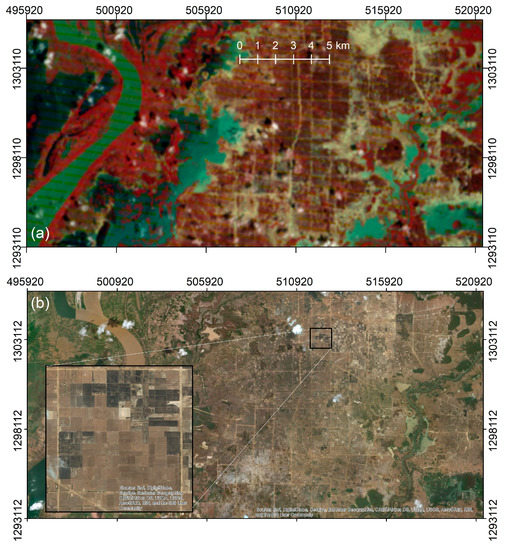 The red inset rectangle (Figure 10a) highlights a wide, dark green canal to the south of the gray asphalt road on the left of the image. Close to the light-brown dirt road running north–south, canals begin running on both the south and north banks. Once the asphalt road crosses the dirt road, the canal south of the main road ends. The dirt road has a small tertiary canal in dark green running along its west side. Dark green colors indicated that the canal was older and had been overgrown by vegetation.