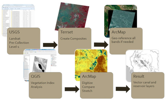 Since the goal of the Khmer Rouge was to create a nationwide irrigation network, the scope of our analysis needed to include the entire geographic area of Cambodia in order to calculate an estimate of the canals and water storage features constructed [14,33]. Landsat data filled that requirement, with the added advantage of having been collected during the time in question. Once acquired, the data was processed as follows in Figure 3: