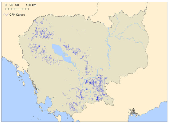 After the capture of Phnom Penh in 1975, the Khmer Rouge, otherwise known as the Communist Party of Kampuchea (CPK) began forcibly relocating the population to rural agricultural areas with the goal of tripling rice production. This would have been accomplished by expanding irrigation systems and increasing to three harvests a year instead of two. Pol Pot, the leader of the CPK, envisioned a canal network arranged in 10-km grids, each with smaller 1 × 1 km canal grids nested inside them (Figure 1a,b) and each again with 100 m × 100 m grids nested inside them. In this way, the entire country could be supplied with water for rice [12,13,14]. This process of canal and dam building was implemented in multiple locations at the same time. Many structures were built quickly, by hand, without heavy equipment or expertise in the field [15].