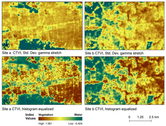 CTVI results for the same locations as in Figure 8, displayed with a standard deviation stretch (a,b), and histogram equalized stretch (c,d).