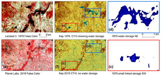 Figure 13 shows water storage sites in Banteay Meanchey, Cambodia, to the east and southeast of a large reservoir called Trapaeng Thmar. The 1979 imagery is shown in false color infrared (Figure 13a) and CTVI (Figure 13b). Two reservoirs can be detected in the early imagery, they are shown enlarged in Figure 13c,d. The reservoir directly to the east (d) stretches north to south over 16 km, and the southeast reservoir (c) measures over 11 km. Figure 13e, shows Planet Labs’ false color infrared imagery from the same location in 2019. The former water storage shows up as bright, bare land. It is difficult to locate the previous location of the southern reservoir. The Planet Labs’ 2019 CTVI (Figure 13f) image makes it clear that there is no water storage at either location currently.