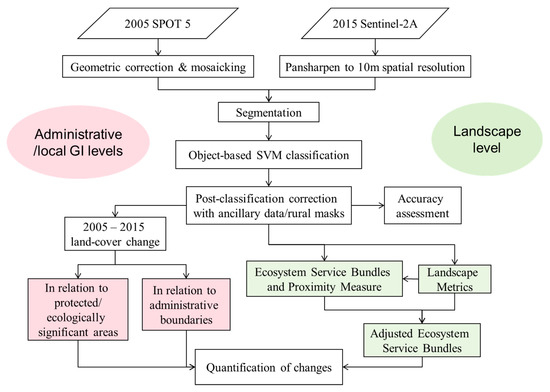 The objectives of this research are therefore to investigate the extent and nature of land-cover change in Stockholm between 2005 and 2015 based on object-oriented support vector machine (SVM) classifications of Sentinel-2A MSI and SPOT-5 high-resolution instruments (HRI) satellite data, and to estimate this change’s impact on and relation to legislatively protected and ecologically significant areas of green infrastructure as well as to assess urban ecosystem service provision bundle changes at the landscape level. This is a complementary dual-level analysis approach: At the landscape regional level, yielding an estimation of overall impacts on ecosystem service provision for the whole region, combined with more specific analysis pertaining to green infrastructure that transcends administrative boundaries and highlights potentially problematic areas, which are localized manifestations of the regional trends. This kind of information can assist policymakers and planners in Stockholm in making both local and regional decisions about future urban development and environmental protection or mitigating measures. This methodological approach can also serve as an informative case study for other cities/countries considering methods for evaluating their progress towards UN SDG target 15.1 and other national environmental policy aims.