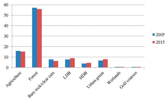In relation to the 2005 class areas, forest decreased by approximately 2% or just over 80 km2 but retains its dominant position in the landscape. Agricultural areas decreased by nearly 4% or 39 km2. Golf courses and wetlands remained relatively stable during this period with no significant change detected for wetlands and a 4 km2 or 14% increase for golf courses. LDB areas increased by 15% or 79 km2 and HDB/road areas increased by 14% or nearly 37 km2.