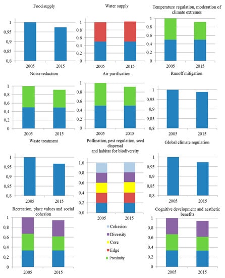 The decreases in forest and agriculture especially have important consequences for the provision of the region’s ecosystem services as the changes in ecosystem service bundles reveal. These changes are shown graphically in Figure 4 and presented in Table 5. Here it can be noted that the loss of forested and agricultural areas slightly negatively impacted the food supply, runoff mitigation, waste treatment and global climate regulation services. However, the services ensuring temperature regulation, noise reduction and air purification were most negatively impacted by an 8%–9% decrease mainly due to the decrease in proximity of forest and an increase in proximity of LDB areas. These proximity changes coupled with an increase in diversity (more even distribution of urban areas in relation to non-urban areas) were the cause of an over 5% decrease in both recreation/place values and aesthetic benefit/cognitive development services.