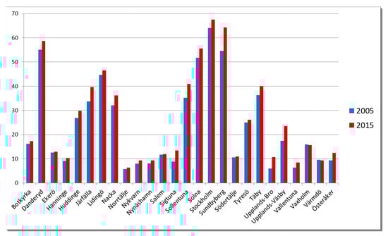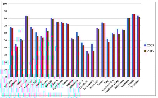 - Stockholmsstad. Statististical Year-Book of Stockholm 2018; Stockholm City: Stockholm, Sweden, 2018; ISBN 91-89311-01-9. Available online: http://statistik.stockholm.se/attachments/article/38/Statistisk%20%C3%83%C2%A5rsbok%20f%C3%83%C2%B6r%20Stockholm%202018.pdf (accessed on 21 April 2019).