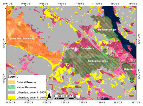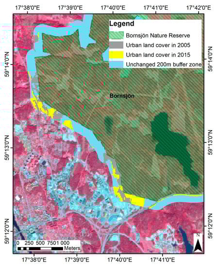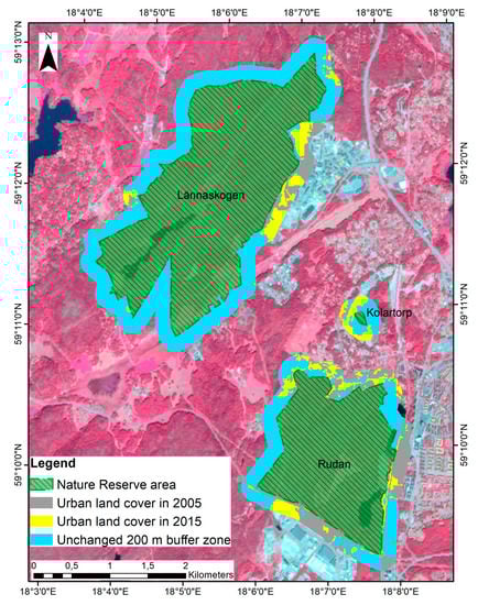 Urban land-cover change in relation to legislatively protected green areas was also investigated. Nature reserves in Sweden are significant green areas in need of protection for a number of possible reasons such as the biodiversity or threatened species they contain or their recreational value. Nature reserves are usually established by county authorities with administrative support from SEPA on a case by case basis often initiated by a proposal from regional or municipal authorities or organizations []. Once established, they enjoy legal protection and are managed by SEPA. SEPA’s directive on action plans for management of green infrastructure notes specifically the importance of transition zones (övergångsmiljöer) between and around non-urban land cover []. Previous research has indicated that effects of light, wind and temperature occur up to 200 m from forest edge [,,] and this distance has been used to evaluate buffer zones around forest reserves in southern Sweden [,]. Hence to evaluate change in transition areas around the nature reserves in the current study area, the urban vs. non-urban composition of a 200 m buffer zone was calculated for both decades and the change quantified. Notable examples of urban change in buffer zones around nature reserves are presented graphically.
