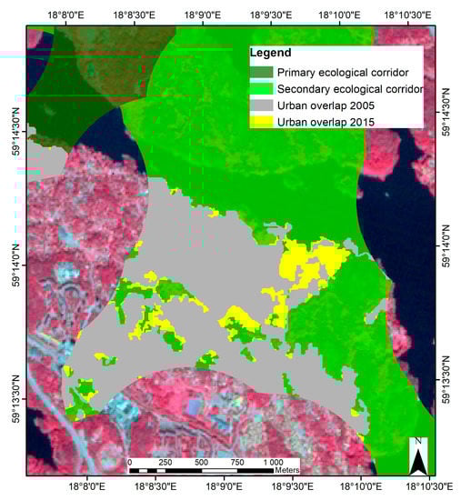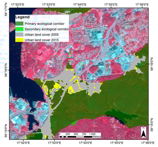 According to the Swedish Environmental Protection Agency (SEPA), green infrastructure is a network of natural areas that contribute to a well-functioning habitat for flora and fauna and to human well-being [,]. While green structure is comprised of the physical components of natural and semi-natural areas in urban settings, green infrastructure entails a more complex network of functions and interactions of green areas, including ecosystem services, that benefit both nature and human beings. One of the key considerations related to Stockholm’s green infrastructure is change in relation to forests []. SCAB states in the draft green infrastructure action plan that perhaps the most important forest species environment are the oak tree habitats given that many of their most valuable patches are located near the city center and dense urban areas. Hardwood deciduous forest and trees are a valuable biotope for biodiversity in the Stockholm region and oak forests, in particular, are a keystone species, which provide a unique set of niches for flora and fauna []. Given the importance of and pressure on oak forests in the Stockholm region, the deciduous (broadleaved) forest ecological corridor network (dispersal distance 2500 m, focus species: marbled rose chafer, Liocola marmorata []) is here compared with change in urban areas (HDB, LDB, roads/railway) between 2005 and 2015. The change in percentage overlap of urban areas with the deciduous forest network is calculated and notable examples of change within the network are presented graphically.