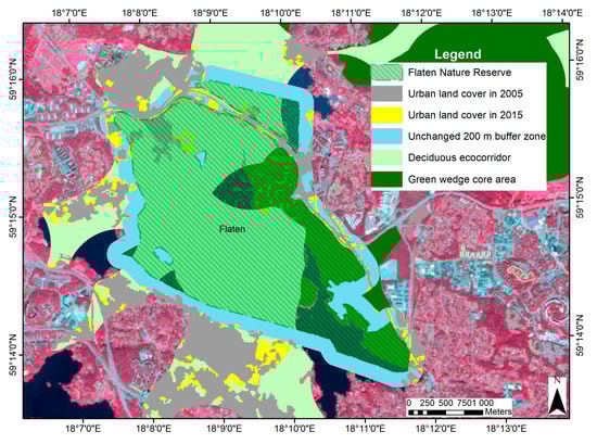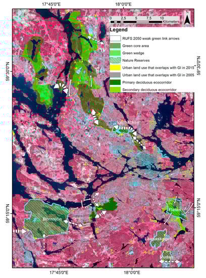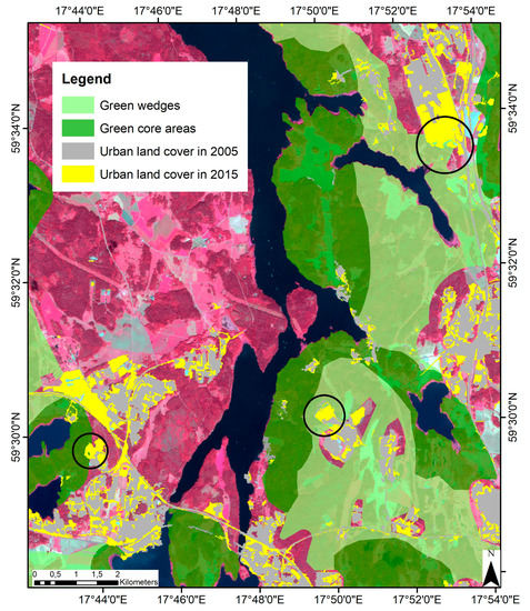 As mentioned earlier, the new regional development plan for Stockholm, known as RUFS 2050, identifies a network of 10 green wedges as representative of the region’s green infrastructure. The wedges are comprised of valuable core areas, sections of general green infrastructure and green “weak links”—areas that often do not measure a width of more than 500 m []. While the wedges do not enjoy legal protection as the nature reserves do, what happens within them in terms of land exploitation is significant for maintenance of biodiversity, ecosystem service provision and quality of life for the region’s inhabitants. The green wedge network is here evaluated in terms of overlap with growing urban areas and change examples are shown graphically. Results of the land-cover change and impact analysis are reported in Section 5.2.2.