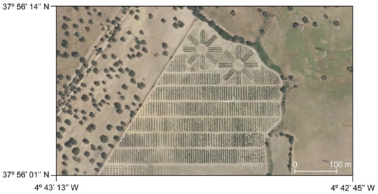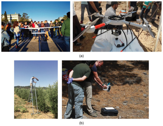 Table 2 summarizes all the materials with which the students work with: three flight platforms, four sensors to register images, auxiliary materials for geometric and atmospheric corrections, as well as different software solutions for the treatment of images. In addition, ETSIAM manages a “nature classroom” with different crops. Among them, there is an orchard with an area equal to 10 hectares of high-density hedgerow olive trees (north latitude 37°56′05′′, west longitude 4°42′59′′, WGS 84) (